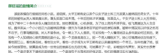 《御廷谣》改编自行烟烟的同名演义,讲解女主孟廷辉一世的据说故事。十年前,孟廷辉被救起,其后满腹才学,在进士科上出尽风头,成为20多年的的一位女官。她为东说念主文韬武略,何况行状圆滑,以金榜题名为诡计,但她亦苛酷阴狠,作念事不留余步,令东说念主生畏,也因此被朝中东说念主冠以奸佞的名头,但她齐满不在乎,也没东说念主知说念她心中所念念。
